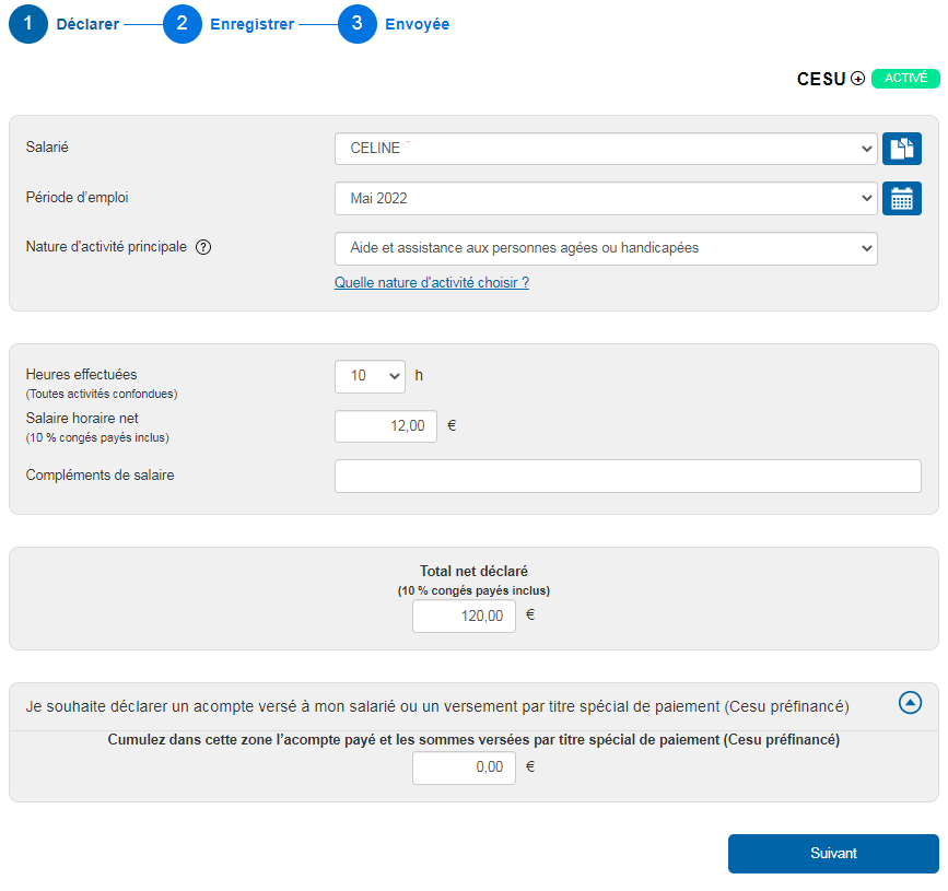 Si vous avez opté pour le Cesu+, vous devez d’abord cocher la case pour autoriser le Cesu à vous prélever du salaire indiqué afin de le virer directement à votre salarié.